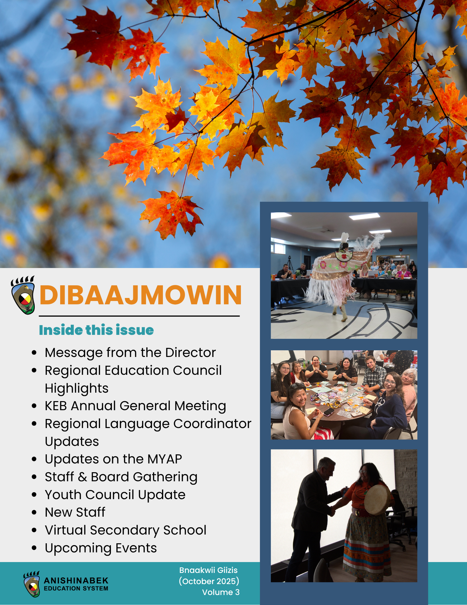 Dibaajmowin is a bi-monthly newsletter produced by the Kinoomaadziwin Education Body that shares program updates, event information, and education highlights from across the Anishinabek Education System.